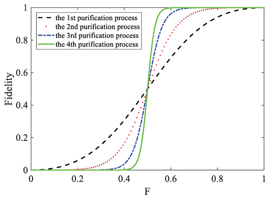 We can obtain higher fidelity after more iterations of the purification procedure in the same initial fidelity F. The limit of is 1 as , which means an infinite number of cycles of purification. However, in practical applications, we can only perform a finite number of iterations. Fortunately, with the increase of purification times, the fidelity quickly approaches 1. Figure 4 shows the fidelity after one to four steps of purification with F from 0 to 1. When the initial fidelity is 0.61, after four cycles of purification, the fidelity can reach 0.999. Users can choose the appropriate number of iterations according to the actual situation.