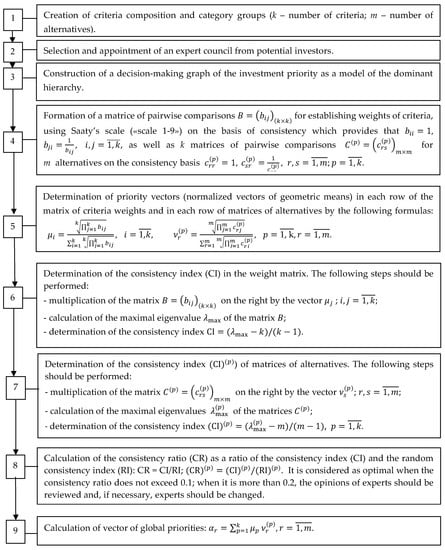 New criteria and new criteria composition for the comparison of investment alternatives were proposed. Considering the sub-criteria could aid establishing weights of groups of criteria. The criteria and alternatives are mutually independent. A multi-criteria approach based on the analytic hierarchy method was used providing a gradual, clear, and logically structured assessment of the parameters of the given alternatives to ensure a successful solution. The proposed approach also has some limitations. For a large number of criteria and alternatives, Saaty’s scale 1–9 could not be enough. The decision-making process could also be time consuming for a large number of criteria and alternatives. For example, in the case of 32 sub-criteria, there appears a large matrix of pairwise comparisons, and for in the literature there is no value of the random index (RI) and only an approximate estimation of the consistency ratio (CR) can be obtained. Therefore, we grouped the 32 new sub-criteria proposed in this study into 12 blocks (potentials). Despite these limitations, the AHP approach is one of the most popular and objective methods for multi-criteria decision-making. The proposed use of the Saaty method for optimal decision-making has a number of advantages, as well. It does not require the unification of the units of measurement for different criteria. It ensures the accuracy of the evaluation by increasing the possibility of intra-matching within the selected criteria. In addition, the presence of a numeric scale allows the relations between the factors to be clearly identified. Finally, this method is adaptable, enabling the criteria composition to be modified by adding or eliminating factors. We compared the maximal eigenvalues obtained as the arithmetic mean of the vector in column DV and the value of obtained using the available mathematical package. With a precision of four digits, the results were the same. It should be emphasized that the consistency ratio (CR) of the pairwise comparison of the 12 groups of criteria, as well as all the 12 consistency ratios , did not exceed 0.1; therefore, the evaluation was consistent.