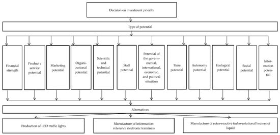 To illustrate practically the Saaty method, we analyze three investment alternatives of startups: the production of LED traffic lights, the manufacture of information–reference electronic terminals, and the manufacture of rotor-reactive turbo-rotational heaters of liquids. The structure of the method is first presented as the dominant hierarchy model in an oriented graph (Figure 2).