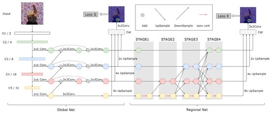 RegionalNet connects the four-scale features in parallel, as shown in Figure 1. At the same time, the features from deep to shallow are gradually increased to form a new level. Therefore, the features of the parallel subnet at a certain level are composed of the features of the same scale from the previous level and other parallel features of different scales. The specific fusion mode is shown in Figure 2. The four-way feature graphs in GlobalNet are added with the features of the corresponding scale at the beginning of each stage in RegionalNet. For features with the same resolution, the bottleneck blocks are stacked directly to maintain self-resolution. For the feature that needs to be increased in the resolution, an upsampling operation is used to add and fuse the feature with the corresponding resolution. For the feature that needs to reduce the resolution, we use 3 × 3 convolution and add/fuse with the corresponding resolution feature. Finally, the features of all scales are concatenated to compute the final heatmap prediction.