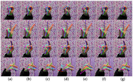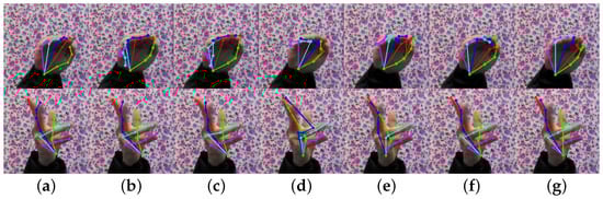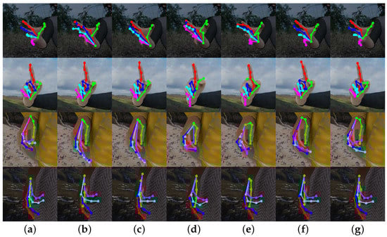 Comparison results on RHD. Where (a) is the true label, (b) is the result of the CPN50 estimation, (c) is the result of the CPN101 estimation, (d) is the result of the HRNet-W32 estimation, (e) is the result of the HRNet-W48 estimation, (f) is the result of our method’s estimation without OHKM, and (g) is the result of our method’s estimation with OHKM.