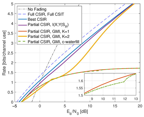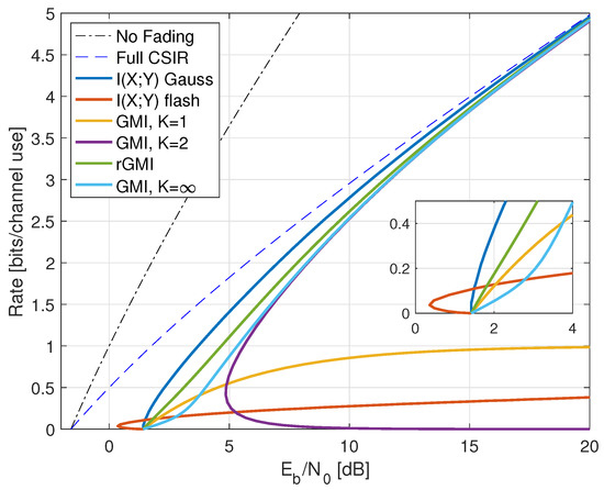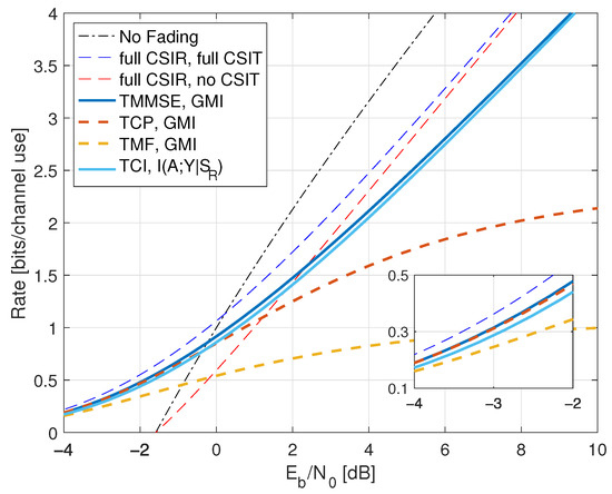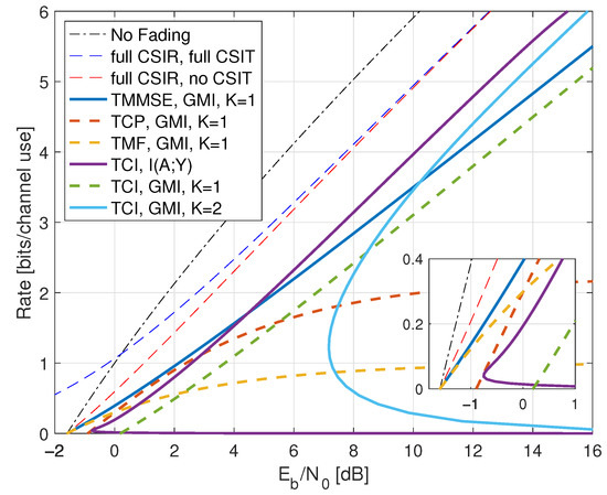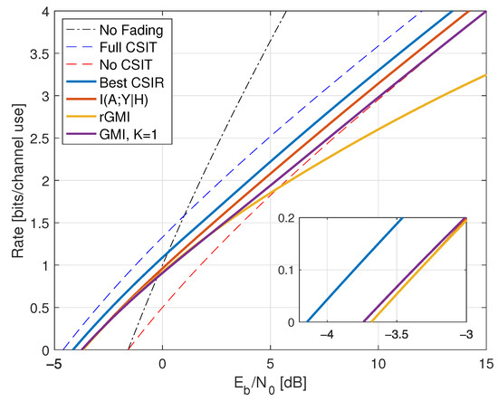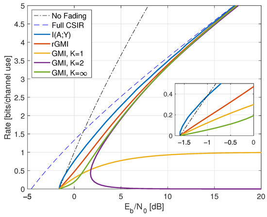 - Inserting , we thus haveWe further have by using (A6) in Appendix A.2, and the high-SNR slope of the GMI matches the slope of but the additive gap to increases. The high SNR rates are shown as the curve labeled “TCI, GMI, K = 2” in Figure 10 for .