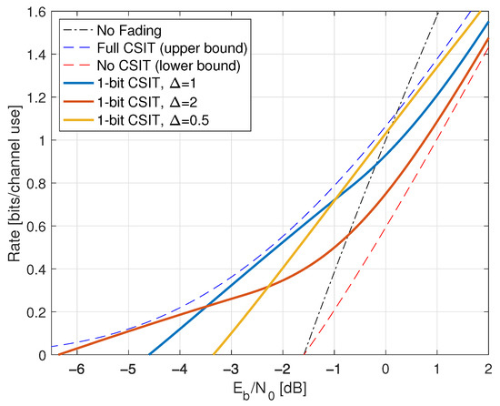 - Goldsmith, A.J.; Varaiya, P.P. Capacity of fading channels with channel side information. IEEE Trans. Inf. Theory 1997, 43, 1986–1992. [Google Scholar] [CrossRef]