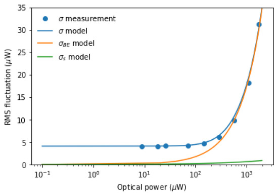 Figure 3 shows the relationship between the measured RMS power and power received by the detector p. The model for was constructed by noting that will be equal to the root sum square of the RMS electronic noise power , , and :