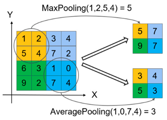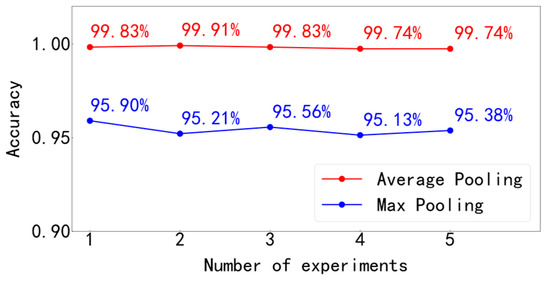The pooling layer is generally used to reduce the dimension of features extracted from convolution layer [24]. There are two common pooling operations in convolutional neural networks, namely, maximum pooling and average pooling. The function of maximum pooling is to extract the maximum value of all data in the pooling window, and the average pooling is used to calculate the average value of all data in the pooling window. The schematic diagram of the two operations is shown in Figure 2, in which the size of the pooling window is 2 × 2 and the step size is 2. The maximum pooling operation takes the maximum value in each of the four small areas to form a new matrix. The average pooling operation takes the average of the values in each small area to form a new matrix. After the two pooling operations, the dimensions of the original matrix have been reduced, but the different operation modes of the two methods also determine their respective advantages. In image processing, the maximum pooling operation can make the feature information more sensitive to texture and contour information, which is beneficial to better identify the key targets in the image. The average pooling operation can make the feature information more sensitive to the background information, but it is easy to blur the image. The model in this paper directly analyzes the bearing fault data. Considering the difference between the values and pictures, the effect of pooling layer is explored in the experiment, and the effect of maximum pooling and average pooling on the accuracy of calculation is compared. We used the maximum pooling layer and the average pooling layer in the MFCNN model, respectively, to conduct five experiments and record the test accuracy. The experimental results are shown in Figure 3. According to the experimental results, the accuracy of using average pooling is generally higher than that of using maximum pooling. Therefore, in this model, the average pooling layer is used to replace the maximum pooling layer commonly used in image processing.