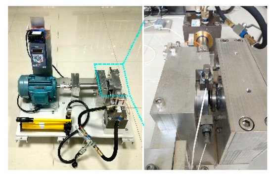 The data used in this experiment is from the joint laboratory of mechanical equipment health monitoring established by Professor Lei Yaguo of Xi’an Jiaotong University and Zhejiang Changxing Sumyoung Technology Co., Ltd. (Huzhou, China). The signal collected in the experiment is the time domain vibration signal of the bearing. The experimental platform of these data is composed of AC motor, motor speed controller, rotating shaft, support bearing, hydraulic loading system, and test bearing, as shown in Figure 5. The rolling bearing model used is LDK UER204, and the specific specifications are shown in Table 2. Several common bearing conditions are shown in Figure 6.