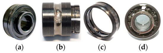 Schematic diagram of various conditions of bearings. (a) Normal conditions. (b) Inner ring fault. (c) Outer ring fault. (d) Cage fault.