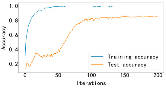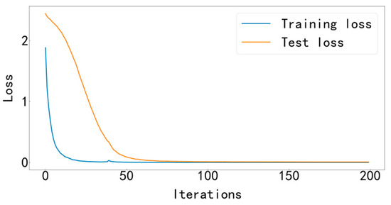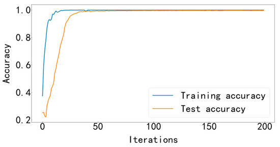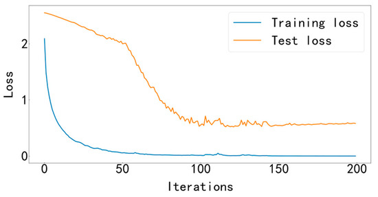 Input the data into the MFCNN model for training, and the training stops after 200 iterations. This experimental model uses the Adam optimizer to automatically optimize the learning rate, making the results more accurate. The cross-entropy loss function is used as the objective function to guide the learning of network parameters. The accuracy curve of training and testing is shown in Figure 9, and the loss curve is shown in Figure 10.