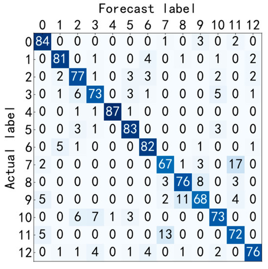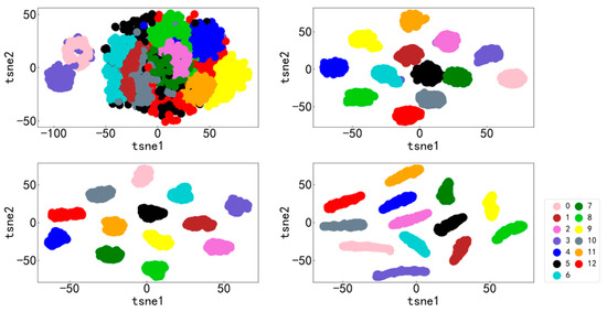 It can be seen from Figure 9 and Figure 10 that the accuracy curve of the training set has completely converged after about 25 iterations, and the accuracy rate has reached 100%. The loss curve decreases rapidly with the iteration, converges completely at about 50 times, and the loss is infinitely close to zero. The accuracy curve of the test set converges completely after about 100 iterations, reaching 99.66%. The loss curve decreases rapidly with the iteration, converges completely at about 100 times, and is infinitely close to zero. Figure 11 shows the confusion matrix of the test set. Its abscissa is the forecast label, and its ordinate is the actual label. It can be seen from the confusion matrix that in the test process, the recognition accuracy of other categories has reached 100%, except for some slight errors on the categories with labels 8 and 10. Figure 12 is a visual diagram of the overall process during training. From the diagram, it can be seen that the distribution of the original data is relatively scattered, with various data mixed together. As the training process progresses, different types of data points gradually disperse, while data points of the same type gradually gather and finally completely separate, achieving excellent classification results. This indicates that the classification effect after training is better. At the same time, it has also been proven that the method proposed in this paper has good diagnostic performance for the multi-fault classification problem of rolling bearings.
