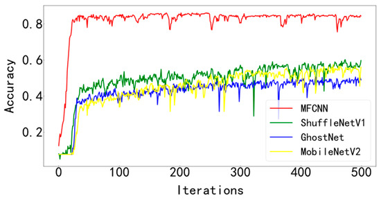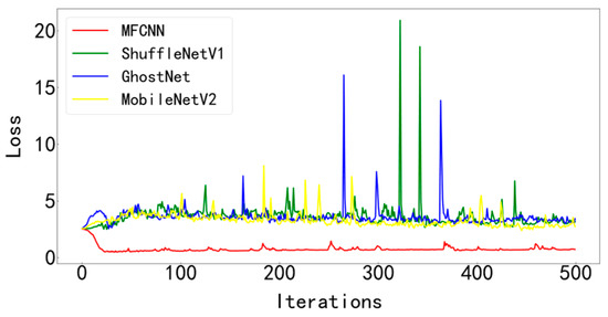 In order to verify the superiority of the proposed method, it is compared with three typical diagnostic methods. During training, the batchsize is set to 128 and the number of iterations is 500. Visualize the final test curve, as shown in Figure 13 and Figure 14. Count the number of parameters in various methods, as shown in Table 4. It can be seen from the results that the method proposed in this paper has the best effect, the accuracy curve and the loss curve converge the fastest in all methods, the accuracy rate reaches the highest 99.83% in all methods, and the loss is the lowest in all methods, which is infinitely close to zero. The number of parameters in this model is the least among various methods, only 28429. The fewer parameters make the computer run with less burden and faster operation speed. Models such as ShuffleNetV1, GhostNet, and MobileNetV2 have a large number of parameters, resulting in longer training times. The test curves of the three typical models fluctuate greatly and are difficult to converge effectively. Compared with the model proposed paper, its accuracy is lower, the loss is greater, and the effect is not satisfactory.