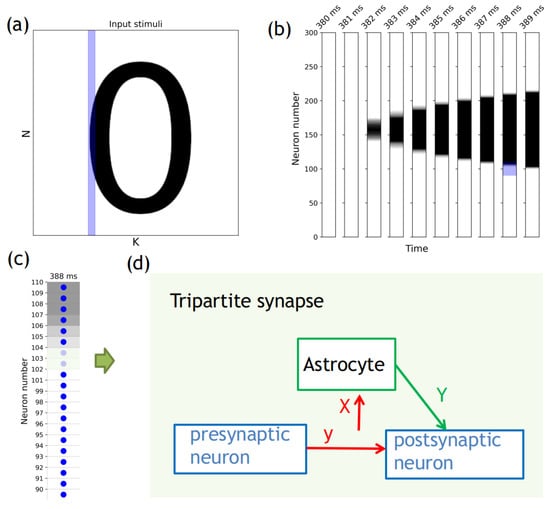 Scheme of the neuron–glial network and procedures for supplying an input stimulus to the neural network: (a) The input image is N by K ( in our case), where N is the number of neurons and K is the duration of stimulus supply to the neural network; (b) The blue area from panel (a) divided into columns of pixel values supplied every subsequent ms; (c) The blue area from panel (b) shows blue dots representing neurons, and the color space around them represents pixel values ranging from 0 for white to for black; (d) The diagram of a tripartite synapse.
