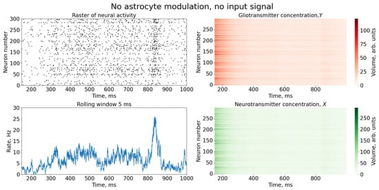 We started simulations of Equations (1)–(8) from the autonomous dynamics of SNN without the astrocyte action and external stimulation. Due to the presence of the inhibitory neurons, network firing was balanced, preventing hyperexcitation. The initial high-frequency burst that occurs due to an arbitrary initial conditions is followed by rare spiking dynamics, as illustrated in Figure 2. The SNN was untrained, and hence, its spikes occur in an irregular manner due to an uncorrelated subthreshold noise drive.