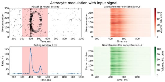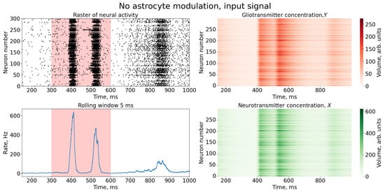 Time series of neural activity (upper left figure in the form of a raster diagram); the corresponding rate of activity of the neural network is the sum of the spikes of the neurons of the network, calculated in a time window of 5 ms (lower left figure) and time series of concentrations of gliotransmitters, Y, (upper right figure) and concentrations of neurotransmitters, X (lower right figure). The red area in the Figure indicates the time duration of the input stimulus.
