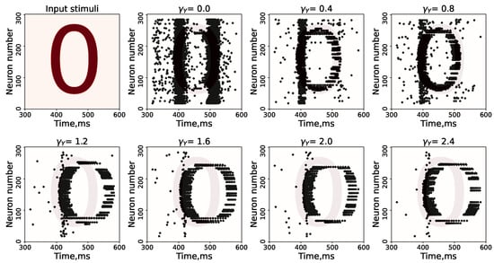 Next, we analyzed how the strength of the astrocyte feedback, controlled by the parameter (Figure 6), affected the quality of the SNN image representation. With the parameter regulating the astrocytic depression of synaptic transmission, the image of the number 0 begins to appear and to disappear as non-periodic burst activity, which prevents the image from being represented on the SNN. Note that starting from a value of the parameter, , equal to 0.8, the image begins to be distorted due to over-depression of the synaptic transmission dynamics but remains visually recognizable.