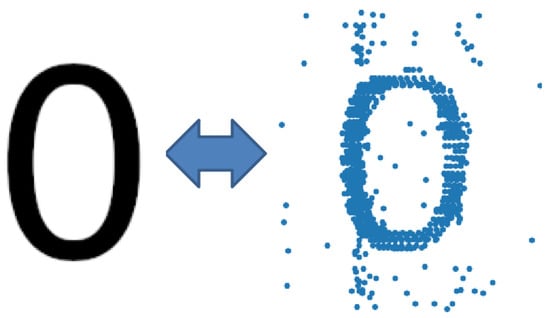 A set of input images of numbers from 0 to 9 was prepared using a freely distributed raster graphics editor (GIMP [82]). The image itself was 300 by 300 pixels (denoted as from Figure 1a). The image was encoded from 0 to 1, , where zeros represented pixels without color, and units were were represented by black. Hence, the equation for the stimulation current, , can be written in the following form: