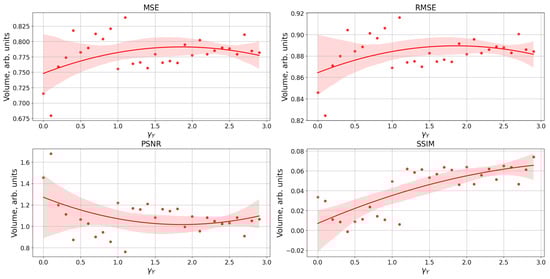 Since a noise signal, , is also fed to the neural network, we also used the PSNR metric (peak signal-to-noise ratio) [94,97] to compare images. This metric allows us to assess the relationship between the maximum possible signal power and the power of the distorting noise that affects the reliability of its presentation. It can be calculated as follows: