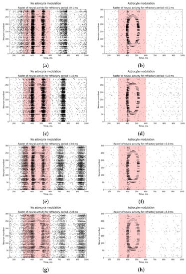 Raster diagram of neural activity when an input stimulus from Figure 1a is applied to the neural network (red area) in the presence (right panel—(b,d,f,h)) and absence (left panel—(a,c,e,g)) of astrocytic modulation under different parameters of the neuron refractory period: 0.1 ms, 1 ms, 3 ms, and 5 ms.