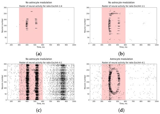 Raster diagram of neural activity when an input stimulus from Figure 1a is applied to the neural network (red area) in the presence (d) and absence (a–c) of astrocytic modulation at different ratios of excitatory and inhibitory neurons: 1:1, 1:4, and 4:1.
