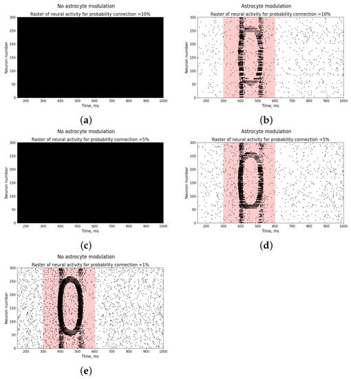 Raster diagram of neural activity when an input stimulus from Figure 1a is applied to the neural network (red area) in the presence (b,d) and absence (a,c,e) of astrocytic modulation at different connection probabilities between neurons: 1%, 5%, and 10%.