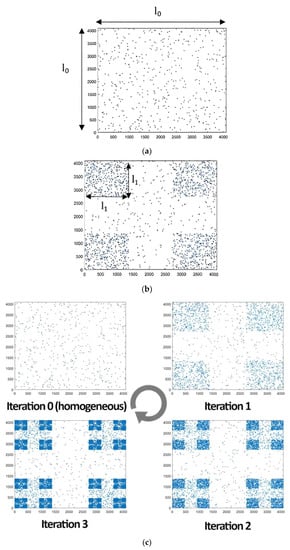 Figure 1. Two-dimensional Cantor clustering model structure: (a) step 1, (b) step 2 and (c) clustering model across iterations ( = 1/3). - Step 2: Remove the areas at the four corners from the initial draw (known in normal 2D Cantor), having sides of size ; θ is a symmetry scale and is the entire scale. Then, throw the same number of points as in the previous iteration into each of these areas (also uniformly random) (Figure 1b).