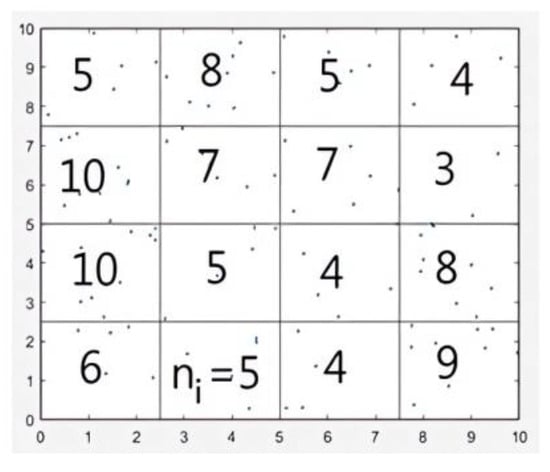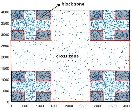 such that and represent, respectively, the number of points having accumulated at the cross zone and at the block zone at iteration i. Moreover, is the number of points that accumulated at the cross zone at the first iteration and is the total number of points at iteration 0, where represents the populating factor (see Figure 3).