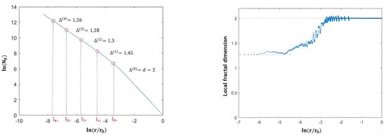To this end, when generalizing , we undertook the analytical study of the shape of the scaling analysis curve through the use of iterations among the topical scales and ∀ i, particularly at small scales. We, therefore, introduced the local fractal dimension , corresponding to iteration i, among the topical scales and .