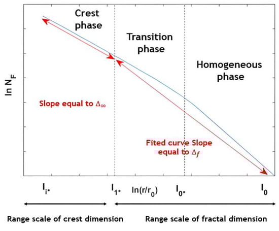 Similar to the dynamics of entropic skins applied in developed turbulence [51,52], we assumed that the intermittent statistic in the fractal clustering model was driven by two specific fractal objects: the bulk and the crest. As such, these two objects were associated, respectively, with the fluctuating structures , with dimension = (at ), such as as the fractal dimension of the phenomena, and , with dimension ().