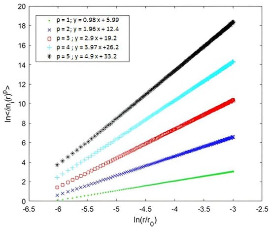 This theory, based on the hypothesis of the homogeneity of energy dissipation, predicts universal laws of scales and for high Reynolds numbers and scales in the inertial range (η , where η and are, respectively, the Kolmogorov scale and the integral scale), such as and being the scaling exponents. Considering the assumption of the refined similarity , this means that [4,5,6,7]. Indeed, Kolmogorov predicted that followed a linear law, as the energy dissipation rate was assumed to be scale-independent according to the homogeneity’s hypothesis (), hence, .