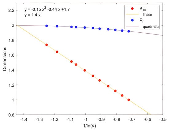 For the scale analysis, we measured the number of meshes affected by the distributed points for each scale r in order to represent the shape of in a logarithmic scale as a function of scale , according to the box-counting method mentioned in Section 1.3. The fractal dimension presented the opposite of the slope of the curve.