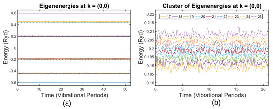 Eigenenergies of the time-dependent Hamiltonian for a 4 × 4 supercell, Equation (22), are shown in Figure 2a. Time is given in the units of the shortest vibrational period, which is 191 Ry for the case of the 4 × 4 supercell. There are 32 eigenenergies because the supercell accommodates 32 atoms; for any moment of time, eigenvalues are not degenerate because atomic positions do not correspond to a highly symmetrical configuration including the initial moment of time , Equation (24). Eigenenergies form clusters that are separated from each other by gaps of several eV.