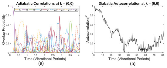 (a) Adiabatic autocorrelation function for the band and overlap probability between the time-dependent solution starting from the th state at and other adiabatic eigenstates. (b) Diabatic autocorrelation function for the band . (Reprinted from ref. [2].)