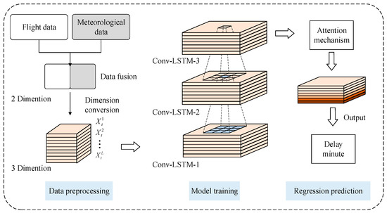 The flight delay regression prediction model consists of three parts which are the data preprocessing when inputting the model, the training of the network, and the prediction when outputting the model. The entire prediction structure is shown in Figure 1. The preprocessing module mainly fuses flight and meteorological data, encodes the fused data and converts dimensions; the model training module is responsible for building the network, learning and training network parameters and saving the model; the prediction module directly outputs the predicted specific time of each flight delay.