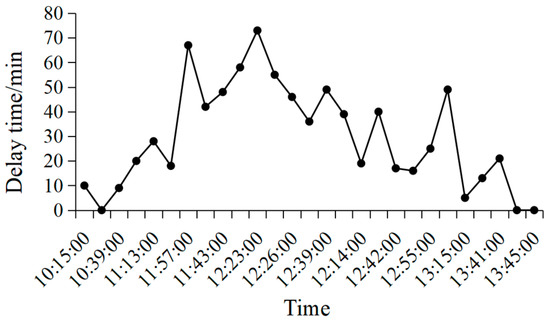 The dataset used in this paper is the flight and meteorological data of four domestic airports provided by the North China Air Traffic Administration, namely Beijing Capital Airport, Beijing Daxing Airport, Tianjin Binhai Airport, and Shijiazhuang Zhengding Airport, with a sample size of 3.05 million, 790,000, 1.07 million, and 590,000, and the data was recorded from September 2019 to October 2020. The flight data includes 23 features, such as “flight number”, “aircraft model”, “take-off and landing time”, “take-off and landing airport”, “altitude”, and “speed”. Meteorological data is recorded every minute and includes 49 features, such as “runway visual range”, “rainfall”, “temperature”, and “wind speed”. In order to better describe the impact of flight delays on the time dimension, Figure 2 shows a statistical graph of flight delay time at Tianjin Airport from 10:00–14:00 on 1 October 2019.