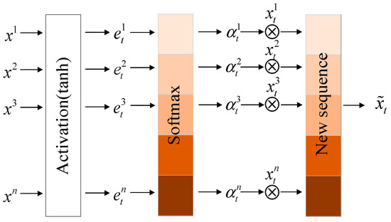 Taking a sample with a sequence length of as an example, as shown in Figure 7, after the output of the Conv-LSTM network, the attention mechanism module connected to it first assigns the sequence an activation function to obtain the sequence , where represents the intermediate state, represents the hidden state, and helps to find the optimal value during the iterative process. Then, through the classifier, each vector in the sequence is assigned a weight value to obtain the weight sequence . Finally, the weight sequence is transposed and summed with the original input sequence to obtain the final output of the attention module. The calculation formula of the whole process is as follows: