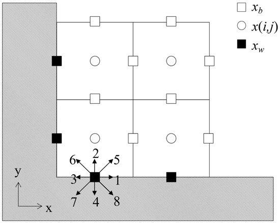 For the no-slip wall boundary, we pick three linearly independent moments (momentum Πx, Πy, and momentum flux Πxx), and impose constraints upon them, i.e., ux = uwx (const), uy = 0, ∂xux = 0 for the south boundary (uwy = 0). Then, by Chapman–Enskog, Πxx = Πxx(0) + τΠxx(1) = Πxx(0) = cs2ρ + ρux2, because Πxx(1) ≈ −2cs2ρ∂xux = 0. We obtain the following three conditions for three unknowns: