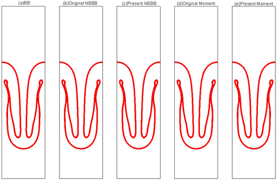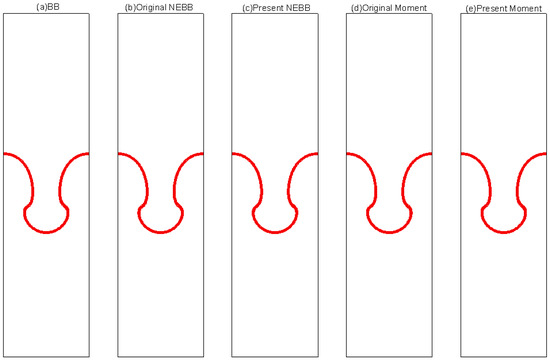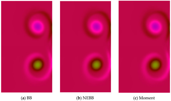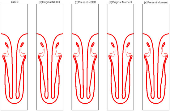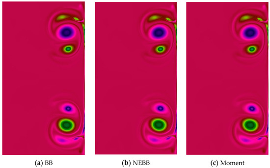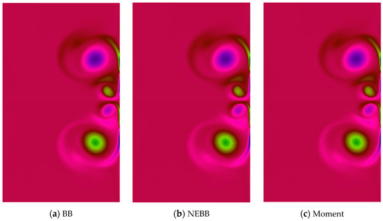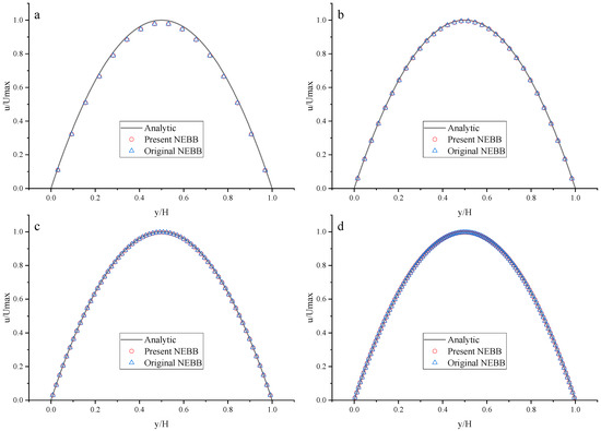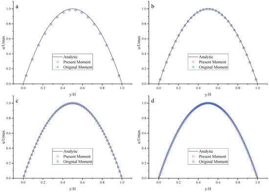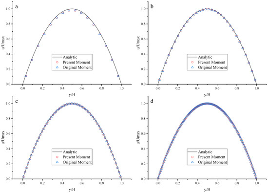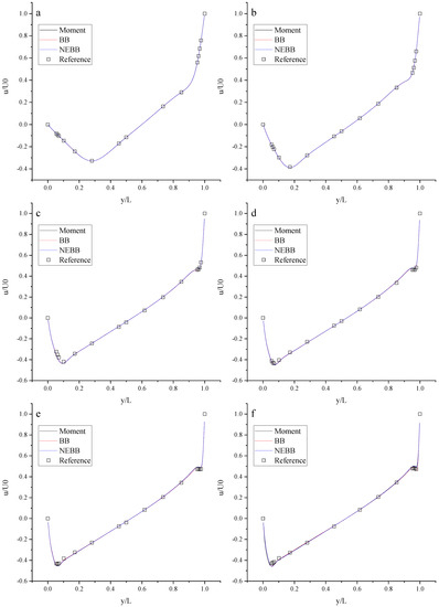 As shown in Equation (34), the only hydrodynamic condition is that the flow rate through the wall is zero in the BB scheme, and the velocity along the wall is undefined. The BB scheme does not impose a boundary condition on the tangential velocity at the wall, resulting in the numerical slip velocity when the external force term exists. Both the NEBB scheme and Moment-based scheme select momentum Πx and Πy, which can satisfy the no-slip condition without generating numerical slip error. So, momentum Πx and Πy are useful in defining the no-slip condition. It seems sensible to choose the hydrodynamic moments instead of the non-hydrodynamic ones that do not appear in these equations of motion [40].