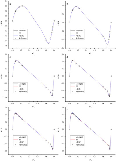 Recently, the moment-based boundary condition has received increased interest and attention [40,41,42,43,44,45], which is based on the moments of the LBM [40] and has not yet been introduced to the DUGKS. Numerical simulations show that the moment-based boundary condition converges with second-order accuracy using dipole–wall collisions [40], natural convection in the square cavity [41], and lid-driven cavity flow [43,44,45]. A numerical simulation of the Poiseuille flow shows that the moment-based boundary condition can eliminate the spurious oscillations seen in solutions using other boundary conditions, considering the nonzero deviatoric stress [42]. The moment-based boundary condition can be parallelized easily for efficient computing, and it is conceptually simpler and more straightforward than other methods that involve a mixture of the bounce-back rule, hydrodynamic moments, momentum corrections, and other modifications to the distribution functions [44].
