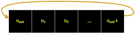 OSPSM (Orbital Shift Pixels Shuffling Method) is a newly proposed scrambling method for digital images. It operates by scanning the pixel values in an orbital form. First, it shuffles all the pixel values of the outermost orbit, starting from the position of the randomly selected pixel (r, c), and then goes to the second outer orbit pixels to shuffle the elements of the second outer orbit starting from the randomly selected pixel position (r’, c’), and so on, until it completes all the orbits of the original image according to the size of the image. We elaborated OSPSM with an example shown in Figure 2, considering a matrix size of 4 × 4 as shown in Figure 2a. In Figure 2b, the pixels of orbits are shuffled by applying OSPSM, starting from the second to last element of the outermost orbit and shuffling all the pixels of the outermost orbit according to the key values. Then, the inner orbit pixels are shuffled, and after the completion of the orbit pixels shuffling, all the pixel values are stored in a long vector form shown in Figure 2c. Later on, the vector is randomly permutated by applying cyclic shuffling techniques using the key value shown in Figure 2d, then reshaped into a 2D matrix shown in Figure 2e. The image that has been scrambled can then be obtained.