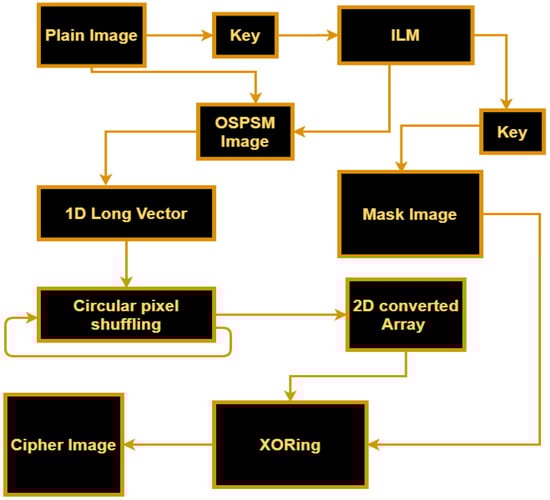 We proposed an image encryption technique based on OSPSM and ILM. Firstly, the initial keys of the chaotic map are generated using pixels of the plain image to make the scheme plain text sensitive. Secondly, the intertwining logistic map is generated using keys obtained in the first step, and the first sequences of the map are utilized as a key value for permutations. The positions of the pixels are shuffled over the entire image without any changing of the value of pixels, which means that the pixels of the plain image go to pixel-level scrambled using OSPSM. After applying OSPSM, the scrambled image is converted into a long vector. Thirdly, we have applied a cyclic shift operation on the vector obtained in the second step to obtain more distortion among the pixels. In the last step, a masked image is generated by intertwining logistic map. The generated mask image is then XORed with the scrambled two-dimensional image matrix. The XORing operation is used to modify the values of the image pixels to make our strategy resistant to histogram attacks. This cipher image is more secure as compared to the other proposed methods. The block diagram of our proposed encryption scheme is shown in Figure 6, which will help to understand the proposed method easily.