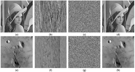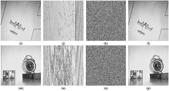 We examined our proposed method with some images to verify its better performance. The encryption and decryption effects are shown in Figure 7. Figure 7a,e,i,m are the plain images with a size of 256 × 256. Figure 7b,f,j,n are pixels shuffling images. Figure 7c,g,k,o are the encrypted images. Figure 7d,h,l,p show the decrypted images.