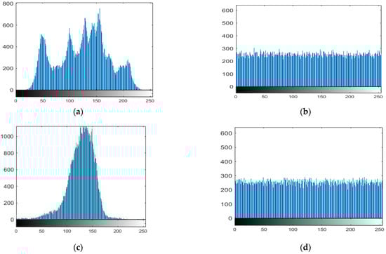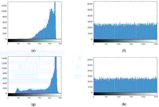 A graphic representation of data regarding the distribution of pixel values is an image’s histogram. The histogram of an ideal encrypted image should be equally distributed and completely different from a plain image to prevent competitors from deriving any pertinent information from the streaming histogram of an encrypted image. We conducted a statistical analysis, and the findings are presented below to demonstrate that our suggested approach is difficult to hack. Figure 10a,c,e,g demonstrates the histograms of the original images (Lena, moon, plane, and clock) with their cipher image histogram in Figure 10b,d,f,h. The size of the original images is 256 × 256.