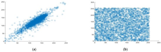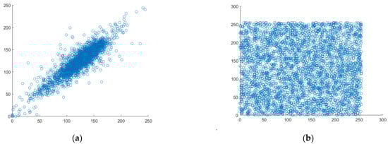 Analyzing the correlation between horizontal pixel pairs. (a) Horizontal correlation in plaintext, (b) Horizontal correlation in ciphertext.