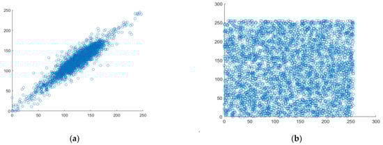The most crucial quality of data that belongs to the category of digital images is good correlation. Each pixel is highly correlated with the pixels around it. Therefore, it could be situated horizontally, vertically, or diagonally. Figure 11, Figure 12 and Figure 13 display scatter plots that indicate the connection between 4000 randomly chosen pixels in different directions, such as horizontal, vertical, and diagonal of both the original plain image and the created cipher image. For the correlation testing, a grayscale moon image with a size of 256 × 256 is used.