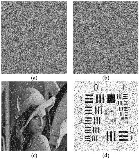 In a real-life situation, the transmission of images may suffer from contamination due to some kind of noise, and occasionally, some part of the image during transmission is also lost. The anti-noise ability is very important for an image encryption algorithm. A good encryption scheme is assumed to defeat noise attacks as well. In the experiment, we introduced the salt and pepper noise with noise densities of 0.1 and 0.3 to the encryption image of Lena and a baboon. Figure 14 shows the encrypted and decrypted images of Lena and 5.1.13, polluted by salt and pepper noise, with a noise density of 0.1 to Lena’s image and 0.3 density to resolution chart image. The proposed image encryption scheme has shown to be resistant to noise effects, as the recovered images remain recognizable even in the presence of noise interference.