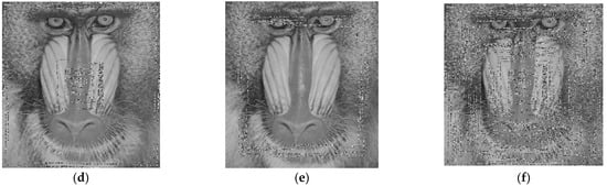 To test the key sensitivity, we made slight changes to the initial key and evaluated the effects. Specifically, it is not possible to obtain the plain image with a slight change in the key, as shown in Figure 9. Table 3 presents the change rates between two encrypted images assembled using the initial key, (as shown in Table 2) and (where n = 1, 2, …, 7), with slight variations in the initial keys (, μ, , , ). The resulting NPCR (number of pixel changing rate, NPCR) for each pair of encrypted images is greater than 99.59%, indicating a high sensitivity to key changes.