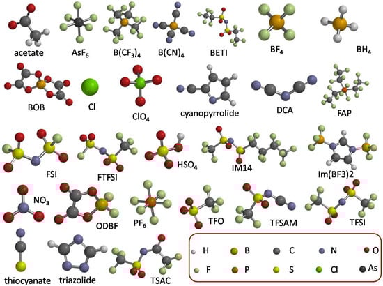 Figure 1 reports the structures of the 27 anions whose anodic limits were experimentally studied in the literature, which will be computationally investigated in the present paper. The experimental values are reported in Table 1, together with the proper literature sources. For the comparison with the experimental data, only the papers with a clear reference electrode were selected. In some cases, we could find only one report of the anodic stability of certain anions. On the contrary, for some of them, there is a large literature (see for example TFSI). We considered the mean of the experimental values when they were available. A typical uncertainty of 0.5 V was obtained. For this reason, we considered this uncertainty in the experimental data.