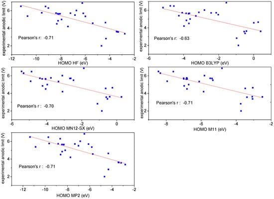 Table 1 displays the values of the HOMO levels calculated by means of the five levels of theory (MP2, HF, B3LYP, MN12-SX and M11), while Figure 2 shows the dependence of the experimental anodic limit from the HOMO level at the different theory levels, together with the best linear-fit lines. The Pearson’s value is similar for all levels of theory (0.70–0.71), except for B3LYP, which has . Even with the best-performing models, one obtains that only of the variation of the anodic limit of anions depends on the HOMO level. Therefore, the correlation values seem relatively small to be highly predictive for the search of better-performing anions.
