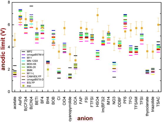 We displayed that performing this kind of calculation on ionic couples gave unphysical results, as similar values of the anodic limit were obtained for ionic liquids containing either the TFSI− or the Cl− anions, which experimentally differ by at least 2 eV [24]. On the contrary, much better results were obtained considering the single anions [22]. The comparison with the experimental data reported in Ref. [25] for ILs containing the TFSI or FSI anion provided evidence that the best way to calculate the anodic limit is by means of a vertical electronic transition (no geometry variation) from the anion to the neutral species [22]. A series of different DFT functionals with increasing levels of complexity, from the Generalized Gradient Approximation to the Range-Separated Hybrid meta-Generalized Gradient Approximation, were compared [23]. The best match with the experimental data reported in Ref. [25] was found by means of the BMK, ωB97M-V and MN12-SX; acceptable results could be obtained by M06-2X, M11, M08-HX and M11-L [23]. Reasonable values were also calculated by means of the less computationally expensive functionals CAM-B3LYP and ωB97X-D [23].