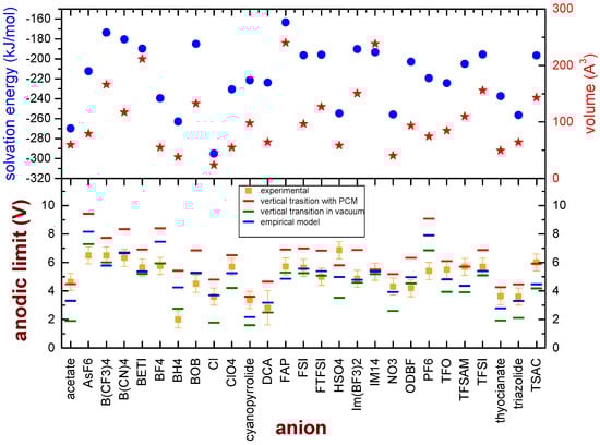 Since some specific ions clearly deviate from the model based on vertical transitions in a vacuum, one may wonder whether these ions share some common chemical or physical features which can explain such discrepancies. All these ions are quite small; moreover, the model is based on electronic transitions in a vacuum, which is certainly a rough approximation of the real environment in which the oxidation of the anion takes place. We considered the DFT functional which overall gives the best agreement with the experimental data (M08-HX), and we calculated the volume of the isolated ions and the solvation energy, obtained as the difference between the energies of the anions in a dielectric medium (2-pentanone, εr = 15.2) and in a vacuum. This dielectric constant was chosen as representative of ILs, as they show εr around 15 [48,49,50]. Moreover, the anodic limit of the 27 anions was calculated considering a vertical transition between the initial anion and the neutral state in the medium. The results are reported in Figure 4. Some general considerations can be derived from this graph: the values of the anodic limit derived from vertical transitions in a polarizable medium are higher than those obtained from vertical transitions in a vacuum, and they are constantly higher than the experimental values. The volume of the anions does not show a clear correlation with the deviation of the anodic limit from the experimental values, as already pointed out by the QSAR analysis. It was reported that a strong correlation between the solvation energies of metal ions and their ionic radii exists, in which the ion solvation energy becomes more positive as the ionic radius increases [51]; however, in the case of the presently investigated anions, for example, not all the ions with a more positive value of the salvation energy are quite large.