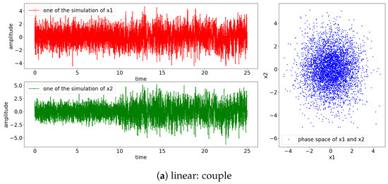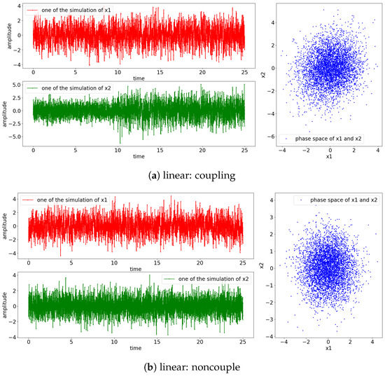 The simulation results for Equations (A65) and (A66) are presented in Figure A1. From the figures, it can be observed that both the linear and nonlinear processes exhibit stationary oscillation, regardless of whether they are coupled or noncoupled.